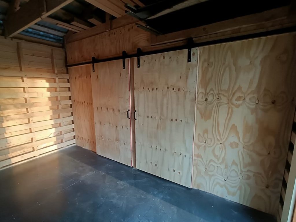 Huussien oviksi rakennettiin puiset vaneripinnoitteiset liukuovet. Liukuovia on helppo käyttää eivätkä ne vie tilaa avautuessaan. Liukuovet lukitaan tuulihaalla sisäpuolelta.